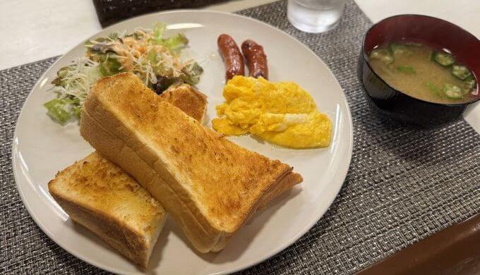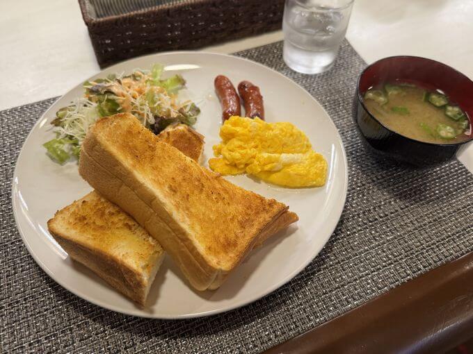 厚切りのトースト、サラダ、ソーセージ、玉子焼き。トーストに味噌汁は珍しい。