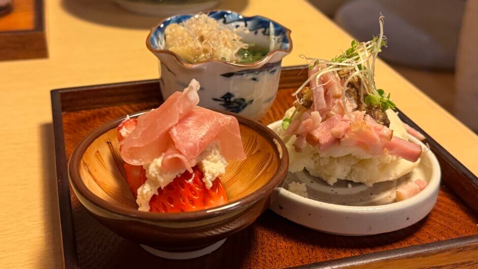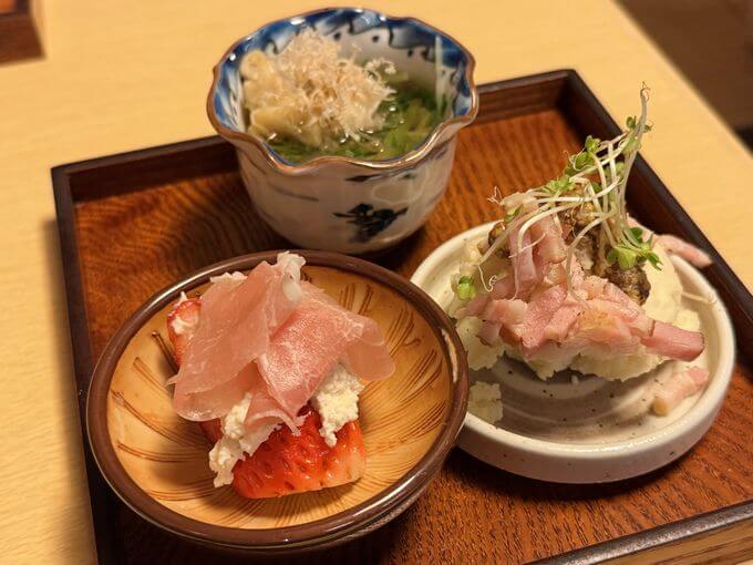 小鉢もレベル高!特にイチゴの上に生ハムが乗ったデザートがかわいい♡